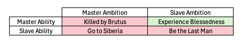It’s absurd that domination can be separated from ressentiment. I’m not sure if this is Nietzsche or Scott’s framing, but it didn’t take a second—let alone hundreds of years—between Bronze Age übermensch like Achilles shitting on everyone and a gruel-eater waking up and thinking: Huh, what if we were the good guys and the nobles were the bad ones? Hmmmmmm . . .
